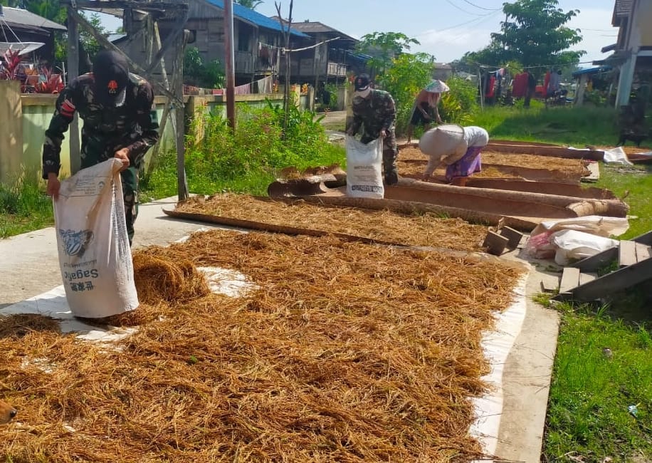 Letda Inf Moh Ridha Fitria Amd.kep,"kehadiran satgas harus menjadi contoh dan tauladan,pekan lalu kami bantu panen padi, sekarang kami juga bantu untuk menjemur apalagi sekarang cuaca lagi panas,jadi bisa cepat kering,kami bantu menjemur dan memasuk kan nya ke dalam karung", harapan nya padi ini bisa untuk persediaan bekal warga beberapa bulan kedepan", imbuhnya.