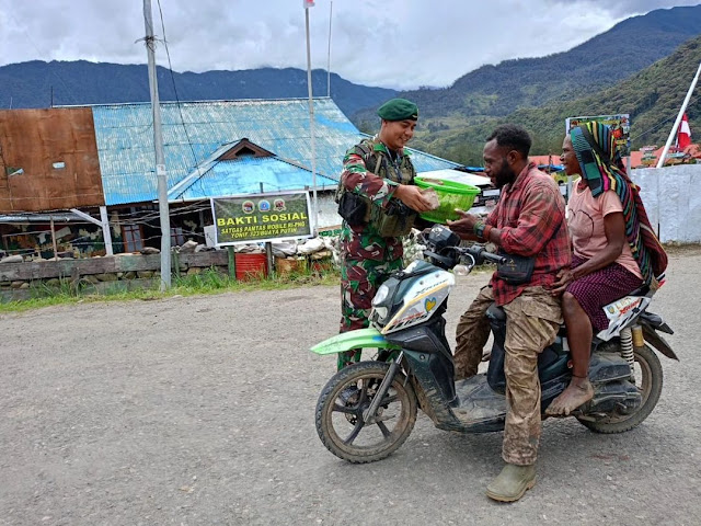 Jakarta. Prajurit Satgas Pamtas RI-PNG Mobile Yonif 323 Kostrad Pos Kout Ilaga Menyalurkan Cinta Kasih nya di kegiatan Minggu Kasih dengan membagikan Nasi Bungkus Kepada Masyarakat yang lewat Depan Pos, Distrik Ilaga, Kab.Puncak, Minggu (10/03/2024).